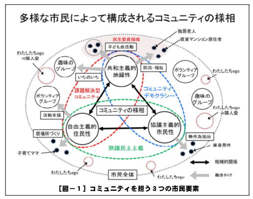 これまでもコミュニティを担う市民のタイプを3つに分けて理解する仮説を提示してきた[註-1]。そこではコミュニティを担う市民として顕在化している3つの市民要素を「共和主義的地縁性」、「自由主義的住民性」、「協議主義的市民性」と名付けた[図-1]。