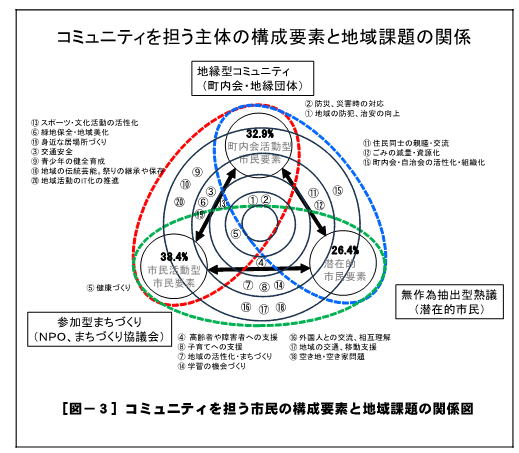 今回のコラムではこの3つのタイプの市民構成要素仮説を町田市のアンケート結果[註ー2]から検証してみたい。