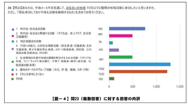 アンケート項目【問23:あなたは、今後4~5年を見通して、お住まいの地域でどのような種類の地域活動に参加したいと思いますか。ただし、「現在参加しており今後も活動を継続するもの」も含めてお答えください。】の結果に着目してみよう[図-4]。