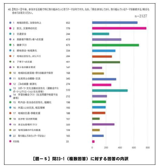 次に【問23-1:今後、参加する活動で特に取り組みたいと思うテーマは何ですか。なお、「現在参加しており、取り組んでいるテーマを継続する」場合も含めてお答えください。】の結果に着目してみよう[図-5]。